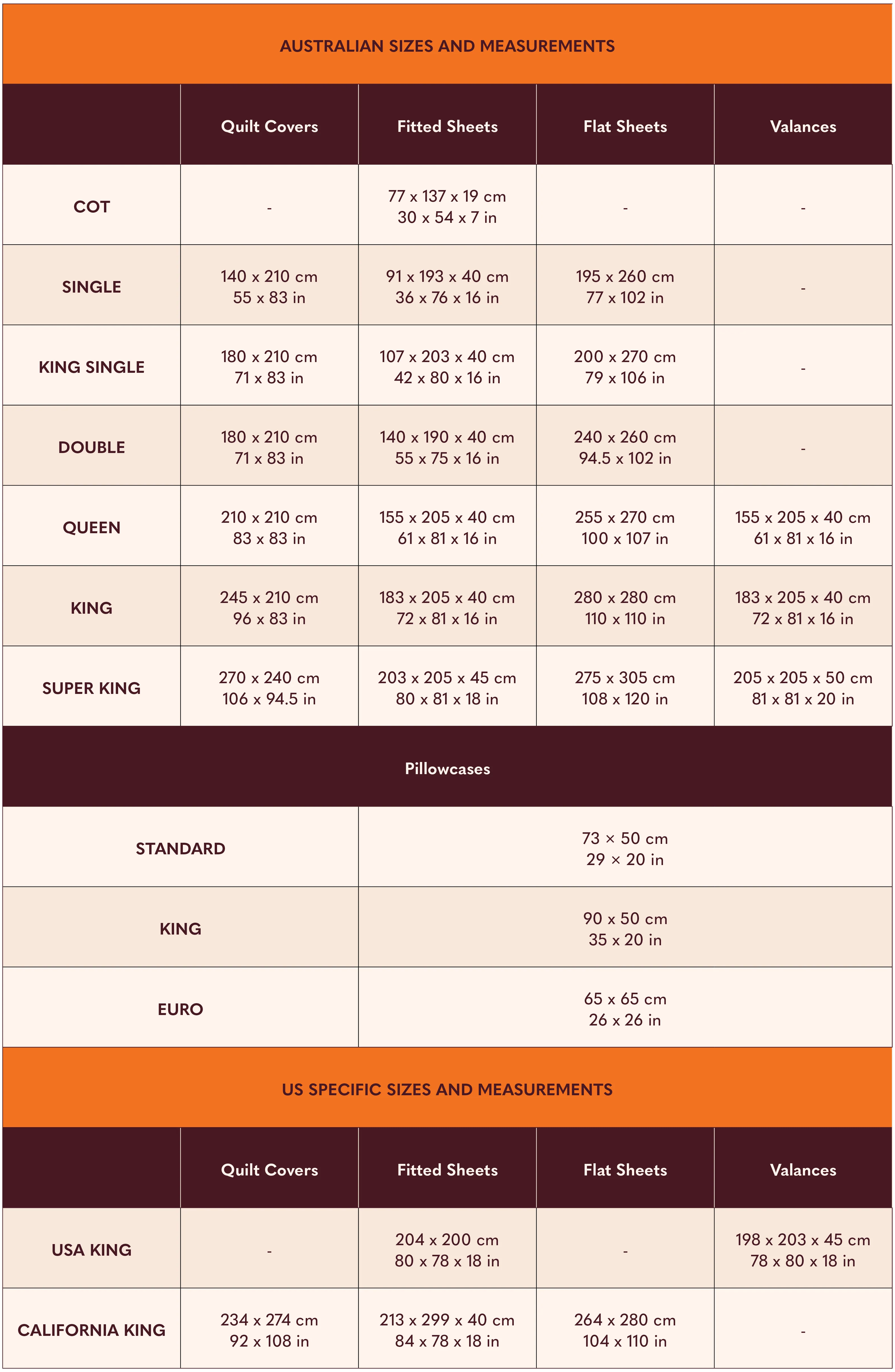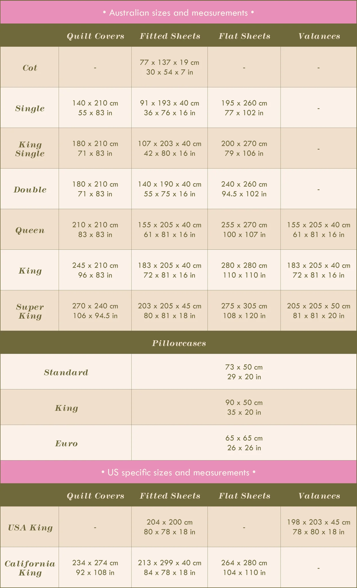 Our bedlinen is sized to Australian standard measurements, as well as some US specific sizes.